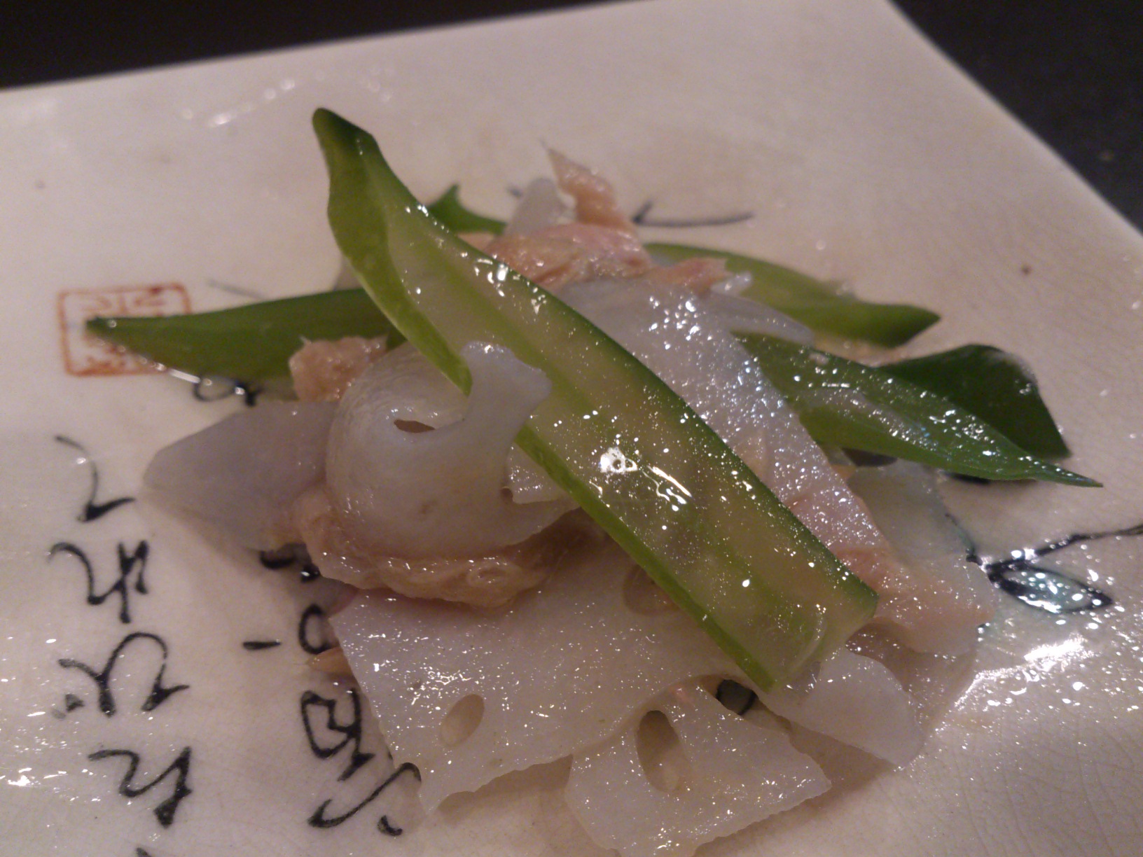蓮根とともにゆがいて、シーチキンとあえました。簡単美味しいが、おうちでは一番ですね。