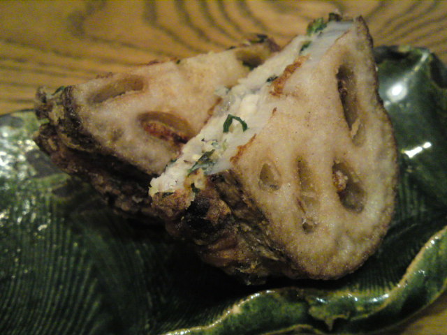 少しの上身と蓮根を主に使いこのようなお料理を作っております。