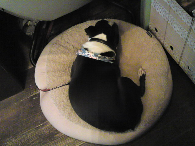 入り口の影で、お気に入りのクッションに埋もれて常に寝ています。も、ちょっと愛想振り撒いてもいいんじゃないかなぁ。ふくちゃん…。