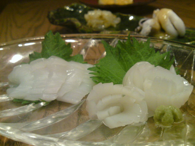 刺身は甘くてねっとり。これをオイルと柚子胡椒であえても絶品、ゲソを肝で煮ても酢味噌であえても絶品。