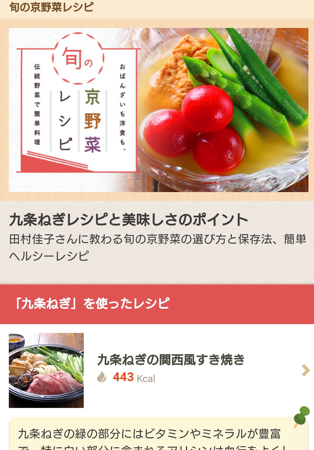 旬は終わりですが、九条ねぎのレシピもいかがですか?普通のねぎでも十分美味しく出来上がります。京野菜も時期になればよかったら楽しんで。4品のレシピがご覧いただけます。食材の詳細やコラムは会員有料です。