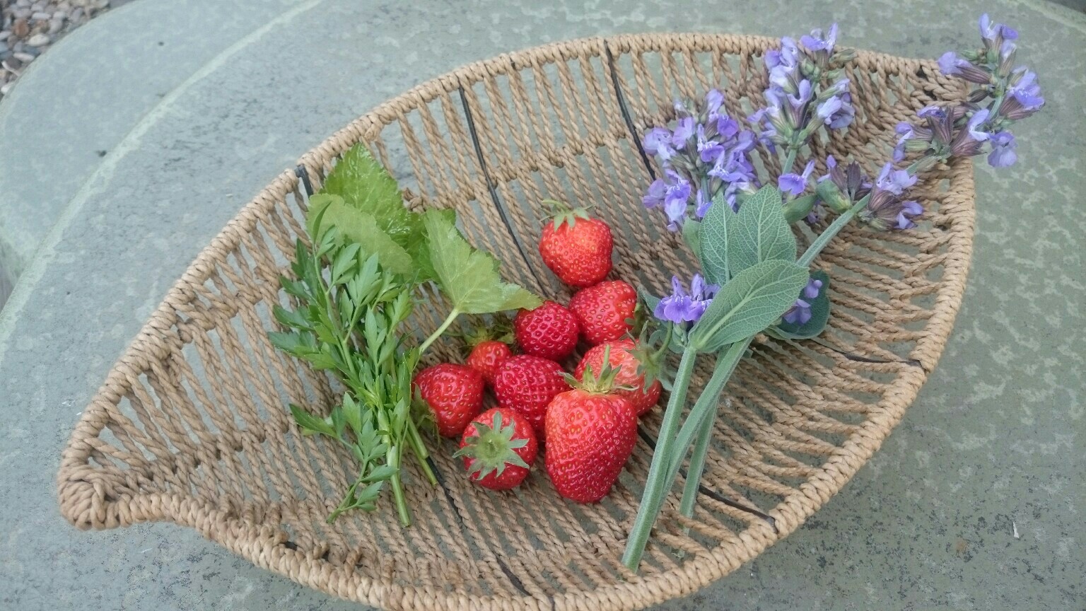 本日の収穫はいちご、スープセロリ、セージの花。挽き肉をハーブと一緒に炒めて香りを楽しもうと思います。