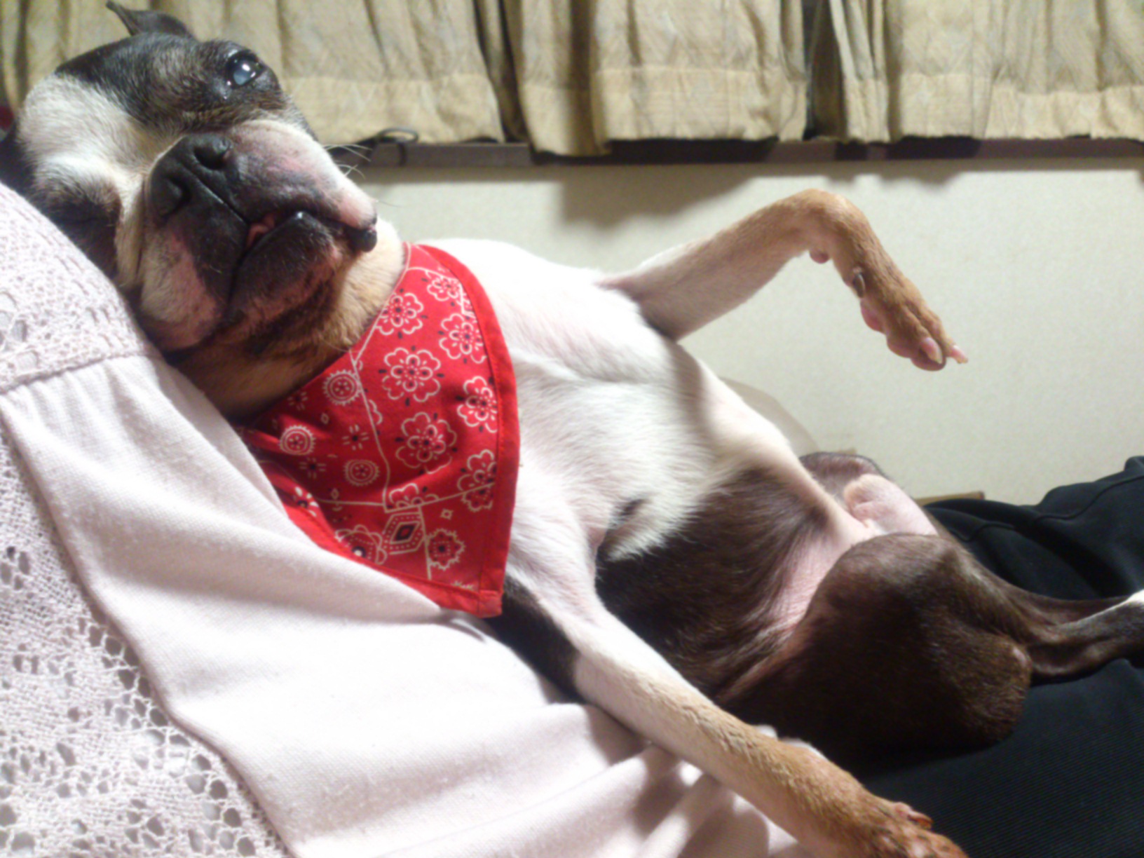 私のお腹の上でくつろいでうとうとしている写真です。白髪が増えたなぁ。