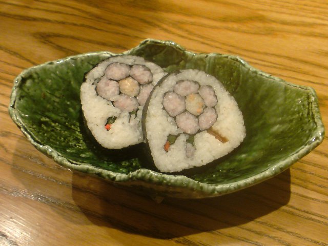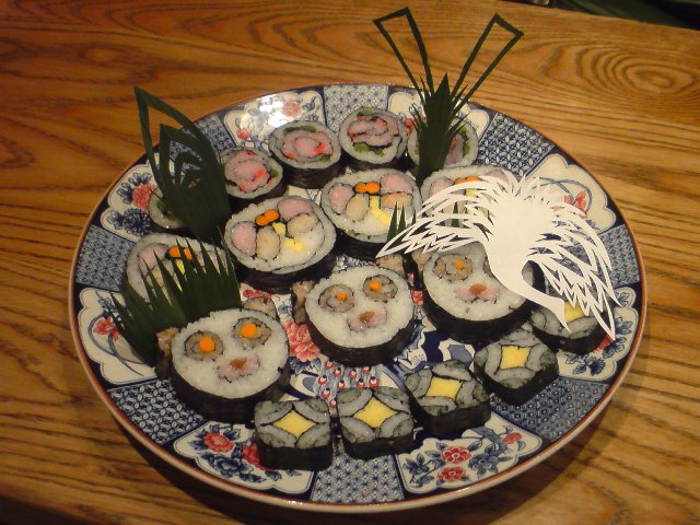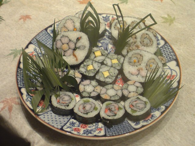 皆様には、講習後、自分の好きな4種の飾り巻きすしを作っていただきました。特大太巻きになってしまったのも含め、およそ10人分。