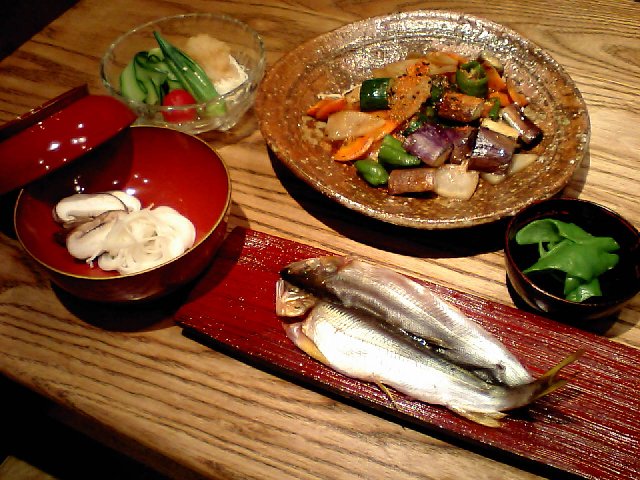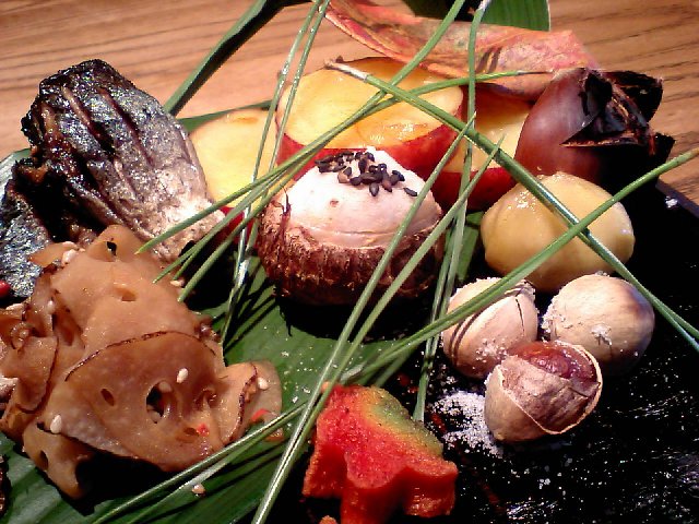 八寸(二十四・ニcm.)四方の杉白木の「片木盆」を茶事に用いてたのが始まりで、茶懐石では、これに山のものと、海のもの二種、またそれに珍味を加えて三種の肴を盛ります。