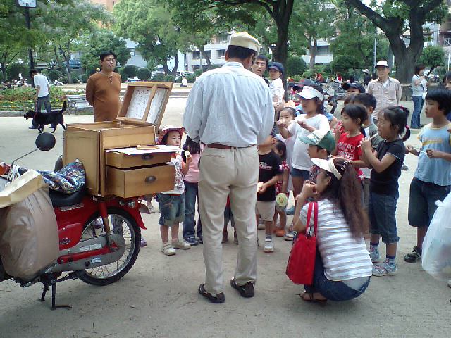 チリンチリンと鈴を鳴らして駄菓子を配り、手書きの紙芝居が始まる。なんて優雅な休日なんでしょう。