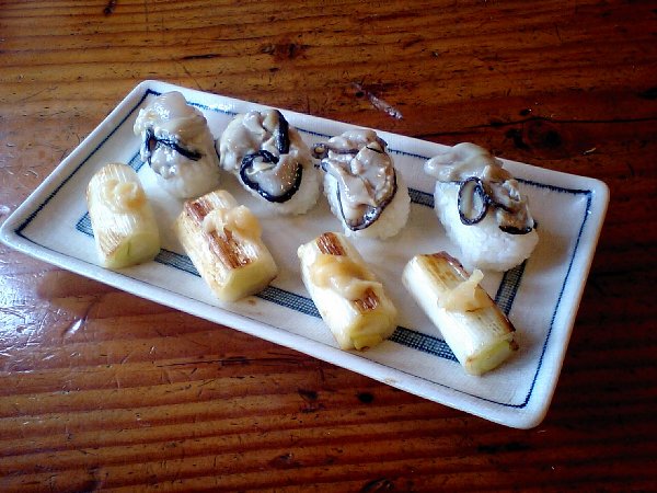 イワガキの寿司と、焼き葱味噌餡。これとイワガキのお刺身をお付けいたしました。